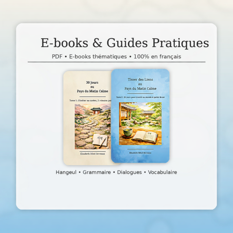 Ressources & Accompagnement Apprendre le coréen avec des supports pensés pour les francophones. E-books & Guides Pratiques Vos guides indispensables 100% en français.Fini les explications complexes et les barrières de la langue.Du Hangeul au vocabulaire du quotidien, mes e-books et guides PDF vous offrent une structure claire et visuelle pour maîtriser le coréen pas à pas.L’essentiel, enfin expliqué simplement en français. Ne pas oublier de suivre mon Livres Fiches de Révision & Exercices « La clé du coréen, c’est la pratique. »Accédez à des fiches de révision synthétiques et des exercices d’application pour ancrer chaque notion durablement.Idéal pour ceux qui veulent progresser en autodidacte sans s’éparpiller. » Accéder aux fiches & exercices Me contacter
